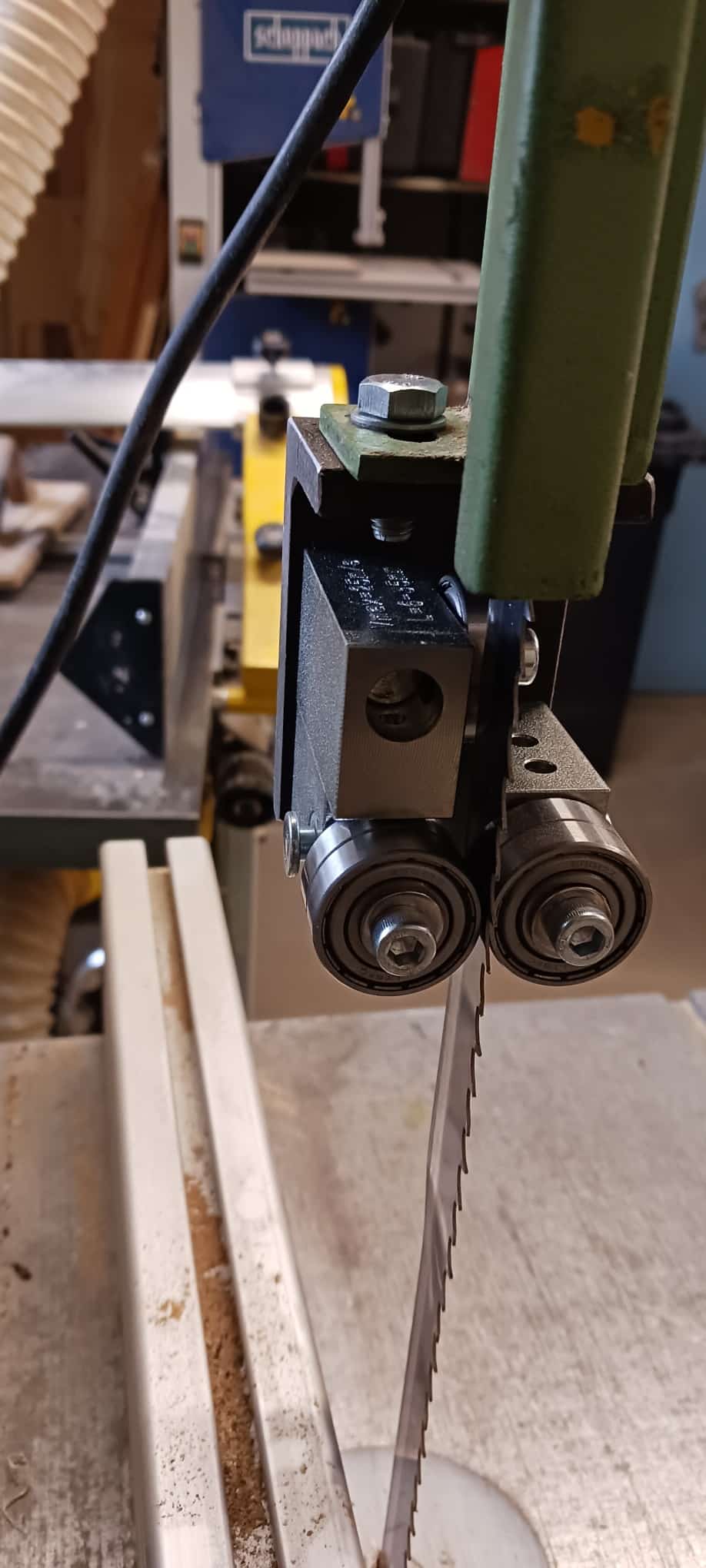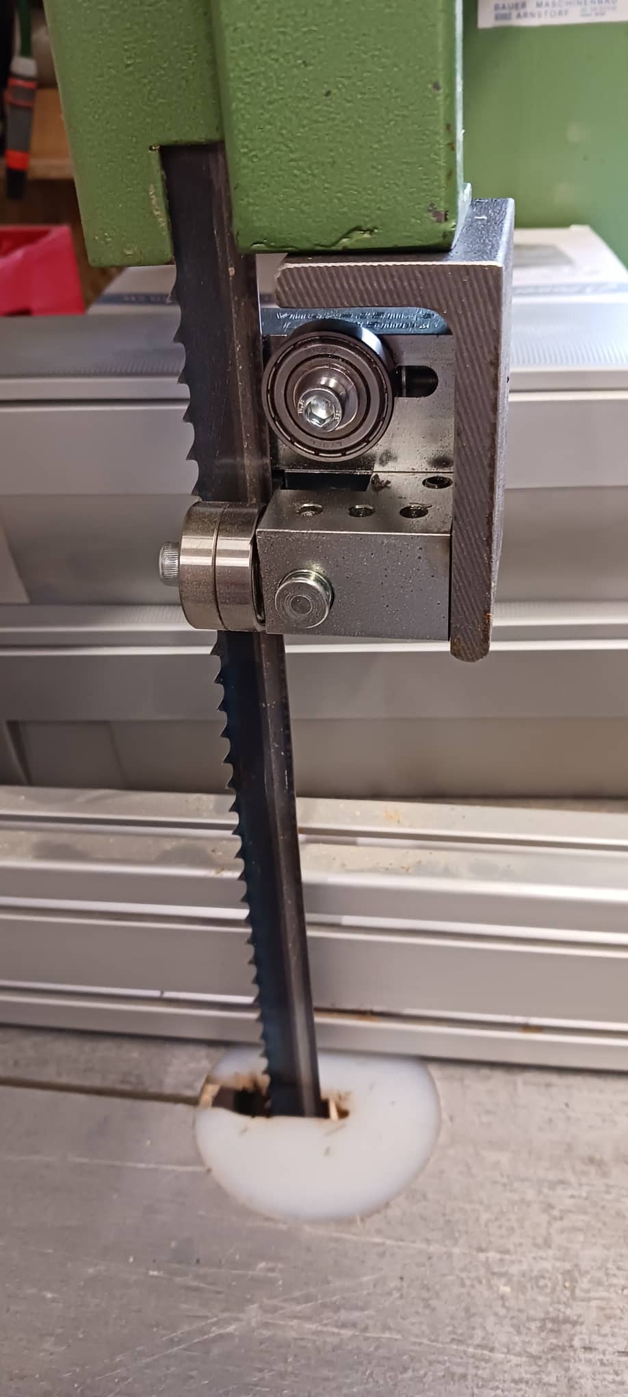Die folgenden Bilder zeigen eine Bandsäge des Typs Bauer HBS 300. Der werkseitige obere Blattführung wurde durch unseren 4×4-Blattführung ersetzt. Es musste nur eine einfache Halterung aus Winkelstahl gefertigt werden. Unser Kunde ist mit dem Endergebnis rundum zufrieden.