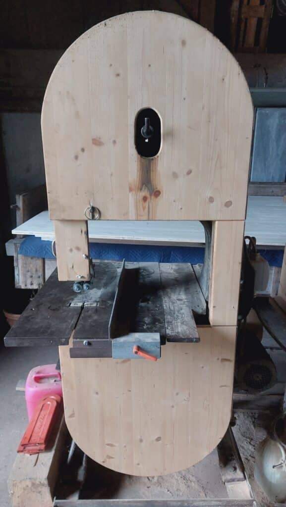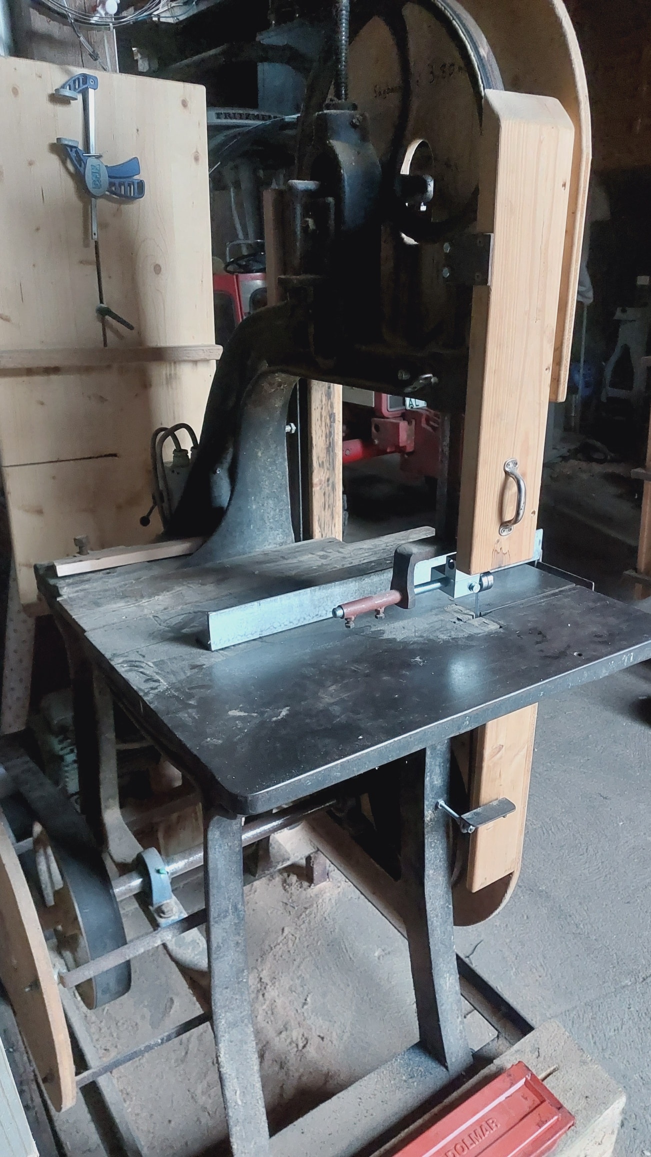 Hier noch ein paar Fotos meiner Bandsäge, Hersteller, Fiedler und Faber aus Leipzig, Baujahr ca. 1900 bis 1914 denn 1914 ging die Firma schon Konkurs. Ich habe die Maschine vor einigen Jahren aus einer alten Wagnerei zum Schrottpreis erstanden und dann vollständig überholt, neue Welle, neue Lager, usw. Die Maschine hatte auch keinen Motor, da sie über Transmission angetrieben wurde.
