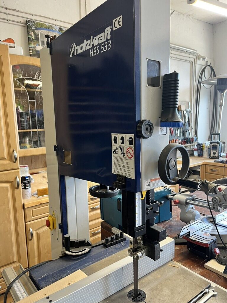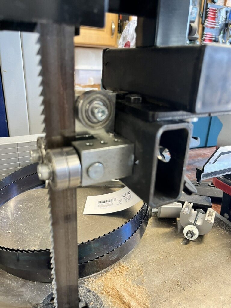 Unser Kunde hat den werkseitigen oberen Sägebandführung seiner Holzkraft-Bandsäge durch unseren 5×5-Sägebandführung ersetzt. Es waren nur minimale Anpassungen erforderlich, ein Halter wurde aus Vierkantrohr gefertigt. Dank unserer Sägebandführung hat sich die Schnittqualität erheblich verbessert!