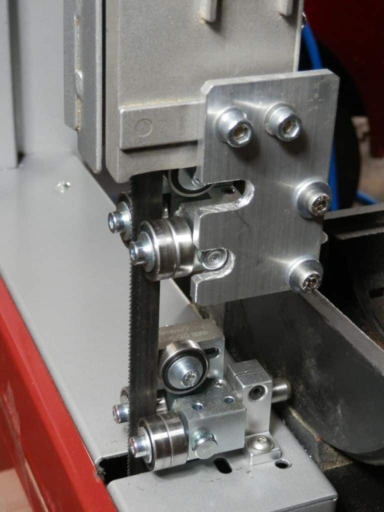 Wenn Sie sehr gerade oder enge Kurven schneiden möchten, ist eine gut einstellbare Sägeblattführung unerlässlich! Ein optimales Schnittbild hängt nicht nur von dem Sägeblatt, der Bandage und der Radeinstellung ab, sondern auch von einer gut einstellbaren Sägeblattführung, die stufenlos für alle verwendeten Banddicken und Bandbreiten eingestellt werden kann.
