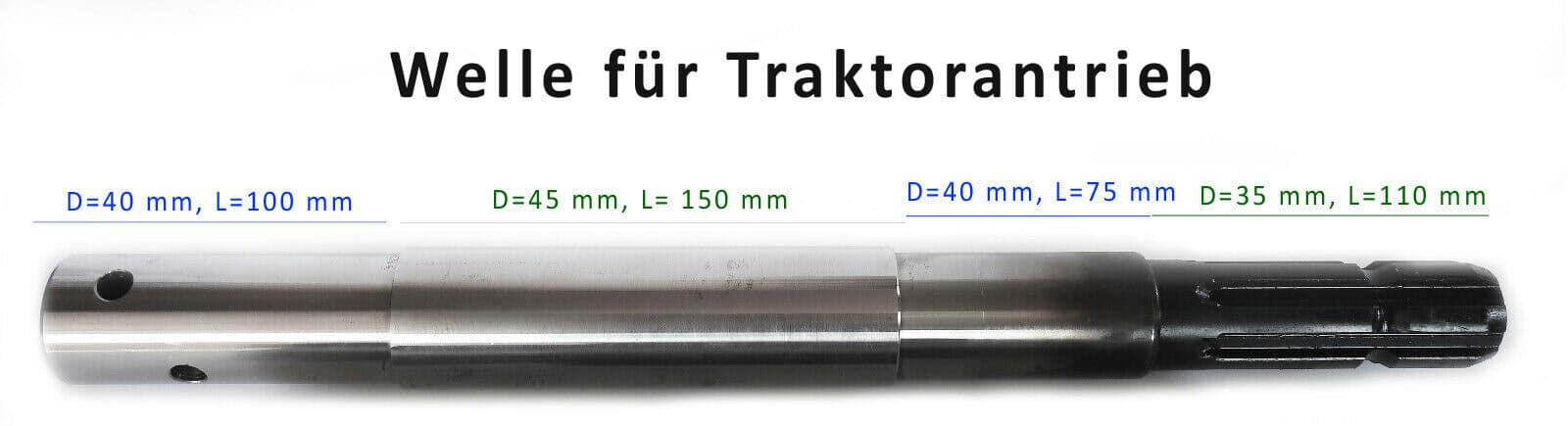Maßgenaue Welle für Zapfwellenantrieb, für unsere Drillkegel. An einem Ende der Welle kann der Drillkegel befestigt werden, am anderen Ende kann die Standard 6 rippige Welle des Traktors angeschlossen werden.