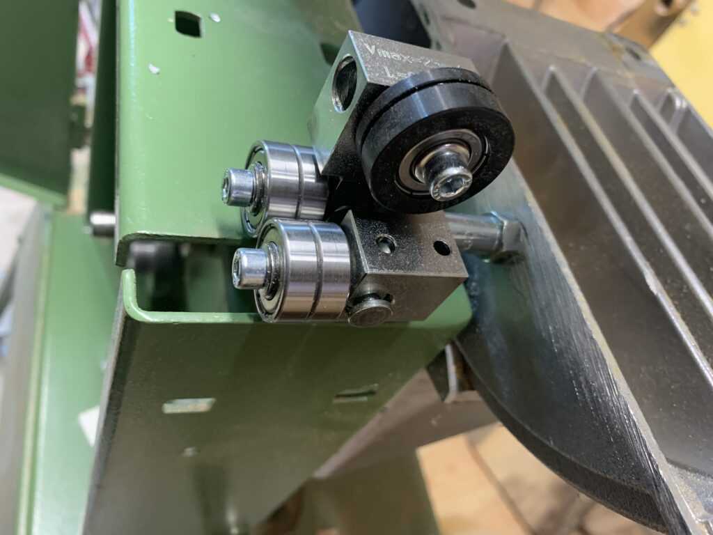 Es wurde unsere 5×5-Sägeblattführung mithilfe der exzentrischen Halterkonsole an der Maschine montiert. Da häufig Kurvenschnitte ausgeführt werden, fiel die Wahl sofort auf die Ausführung mit genuteter Stahlbuchse. Bei den seitlichen Lagergruppen wurde das vordere Lager durch einen Ring ersetzt, sodass auch die schmalstmöglichen Sägeblätter verwendet werden können.