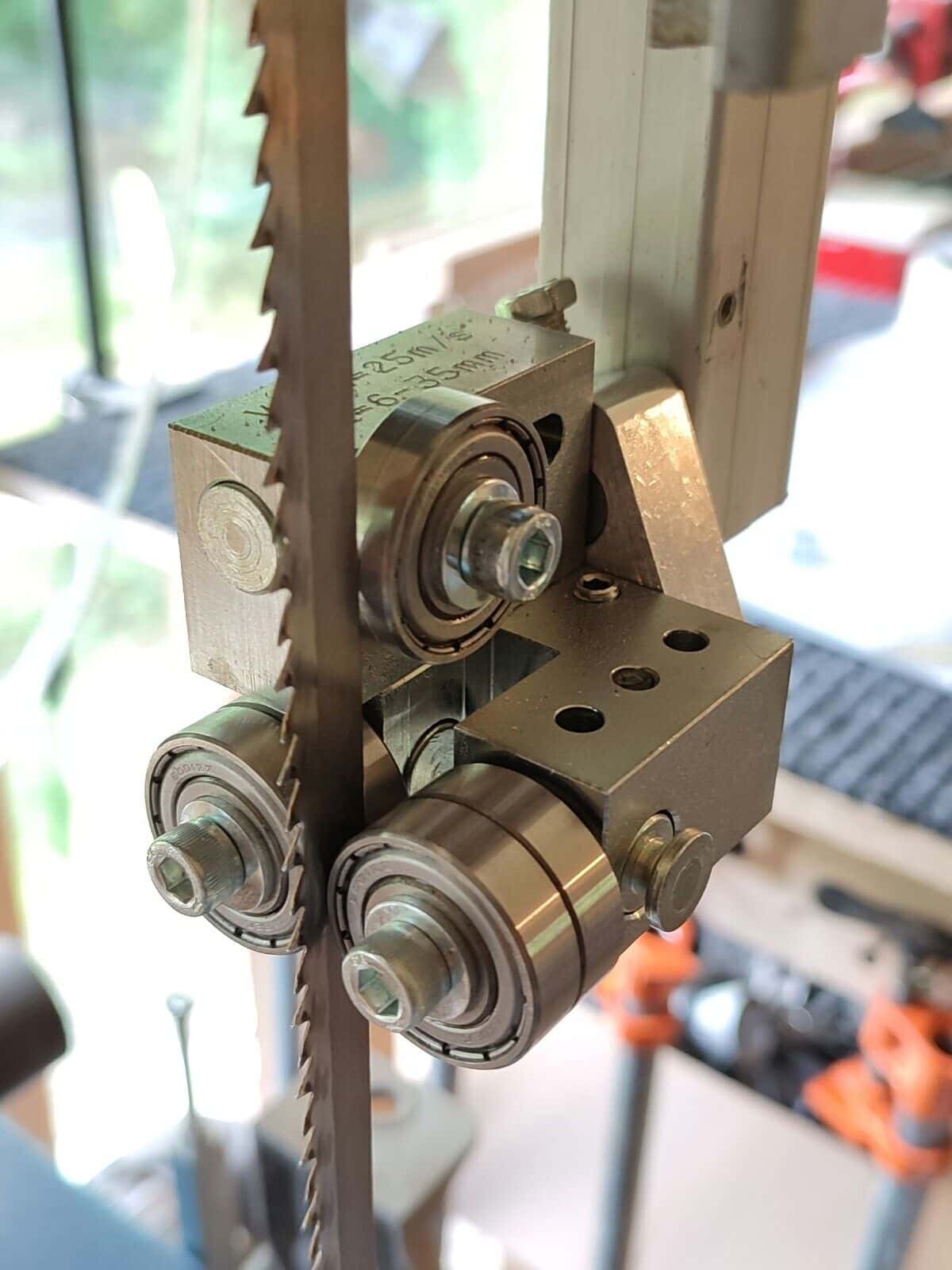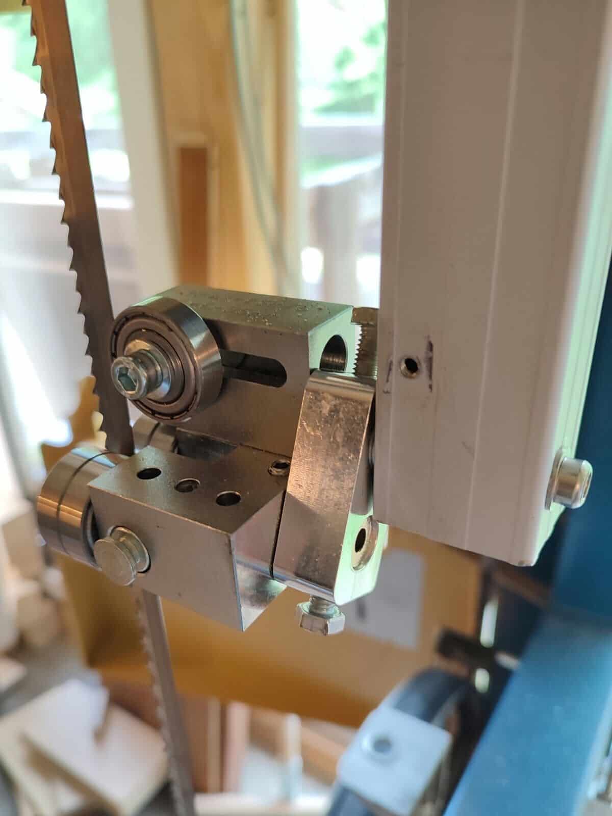 Hier kommen einige Fotos von einem unserer geschätzten Kunden. Unsere 5×5 Blattührungen wurden an einer Scheppach BASATO 4 Bandsäge montiert. Sowohl die untere als auch die obere originale Blattführung wurden ersetzt. Bei dieser Maschine können die originalen Halterungen für den Umbau verwendet werden, was den Umbau nicht allzu arbeitsintensiv macht. Das Ergebnis ist jedoch überzeugend: Die Schnittqualität verbessert sich erheblich!