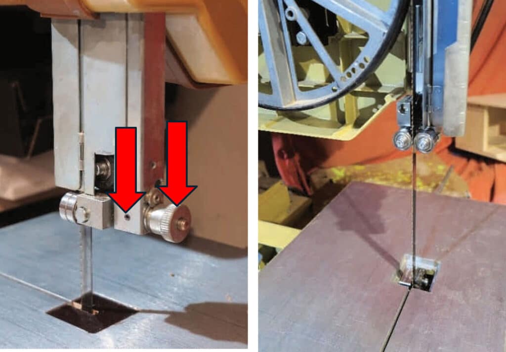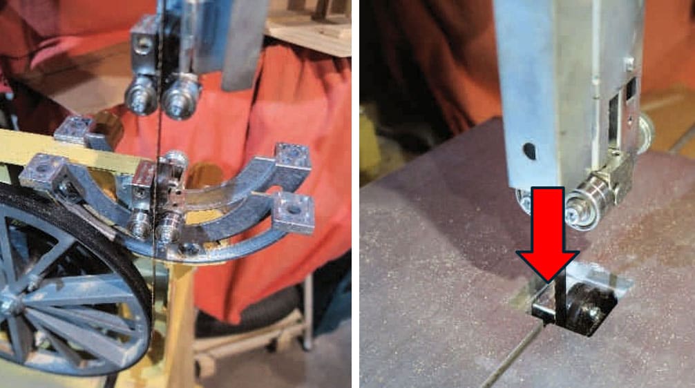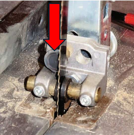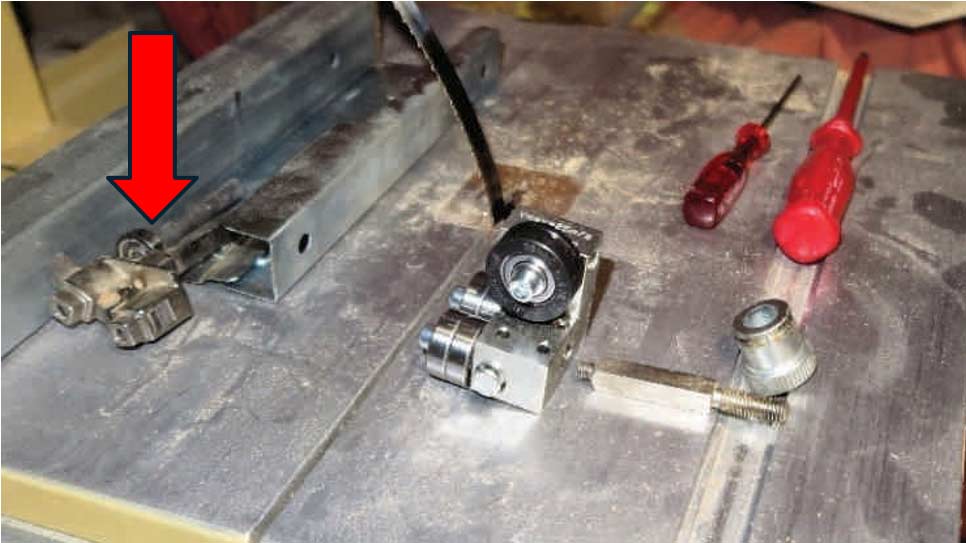 Die Montage der unteren Sägeblattführung geschieht analog wie oben beschrieben, einziger Unterschied: Das hintere Stützlager ist jetzt oben, die beiden Stützlagerrollen sind also immer näher am Sägewerk- stück, als die seitlichen Führungsrollen. Aber: Für das geniale Drillkegelwerkzeug ist die Aussparung im Sägetisch zu klein, das Stützrad kann sich nicht frei drehen und die Winkeleinstellung des Sägetisches funktioniert nicht mehr. Die nächste Aufgabe steht an, die Aussparung anpassen.