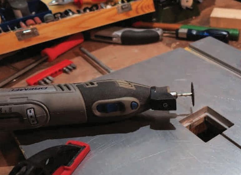 Mit Dremel ausschleifen? Ach was, in klassischer Handarbeit mit Feile. Aber Achtung, nicht die ganze Auf- lage für die Tischeinlage entfernen, Bedarf am Objekt messen. Ggf. in Schritten arbeiten, anfänglich lieber zu wenig Material abfeilen, statt zuviel, siehe die folgenden Bilder.