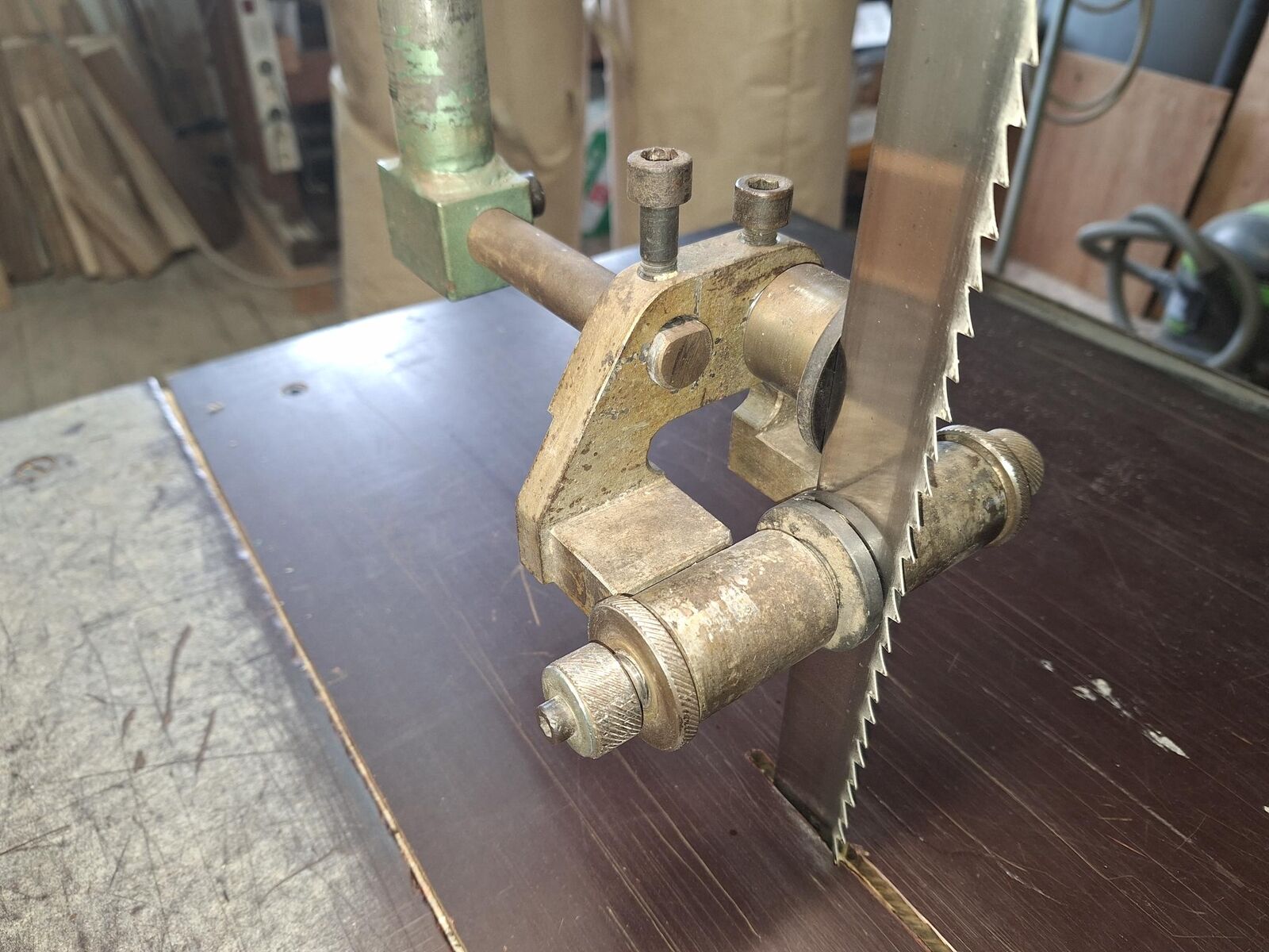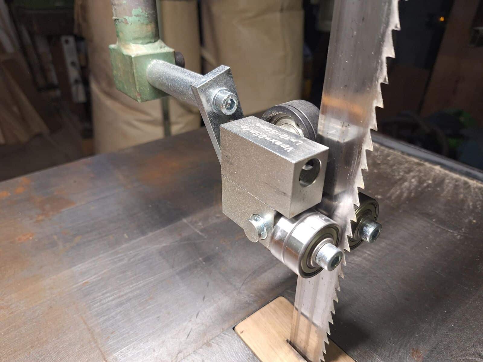 Unser slowenischer Kunde hat uns einige Bilder geschickt. Er hat der Sägeblattführung an einer selbstgemachter Bandsäge ausgetauscht. Der Austausch war mit unserer Exzentrischer Halterkonsole kinderleicht, und unser 6×6 Sägeblattführung mit der Rolle für Kurvenschnitte leistet perfekte Arbeit. Schnittqualität wurde wesentlich besser! Vielen Dank!